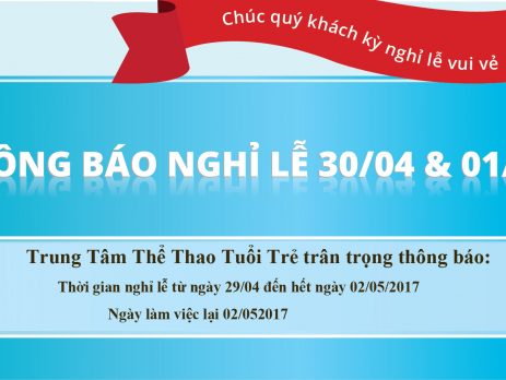 Thông Báo Lịch Nghỉ Lễ 30/04 - 01/05 năm 2017Trung tâm Thể thao Tuổi Trẻ trân trọng thông báo lịch nghỉ [...]